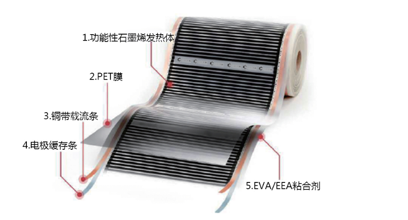 石墨烯电热膜是一种通电后能发热的聚酯薄膜,由可导电的复合石墨烯发热油墨材料、金属载流条、银浆经印刷加工,热压在绝缘聚酯薄膜间制成。